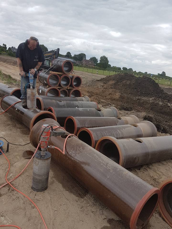 In samenwerkin met Aad Kamping Betonboor/Sloop & Klusbedrijf boorden wij deze buizen.